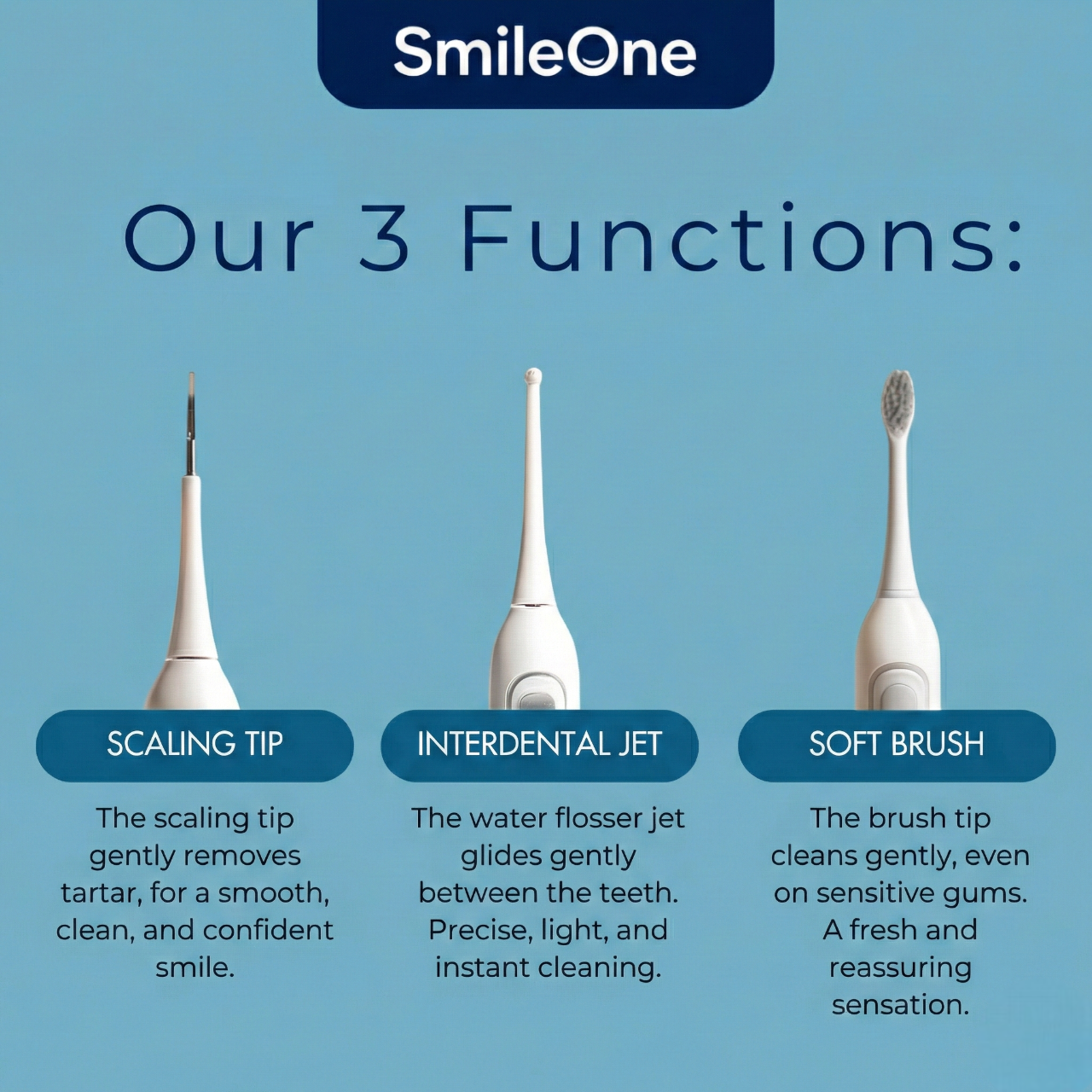 The Smile One Anti-tartar tip helps reduce plaque buildup gently. Thanks to its controlled vibrations, it gently smooths the tooth surface and restores that clean feeling everyone wants, without stress...